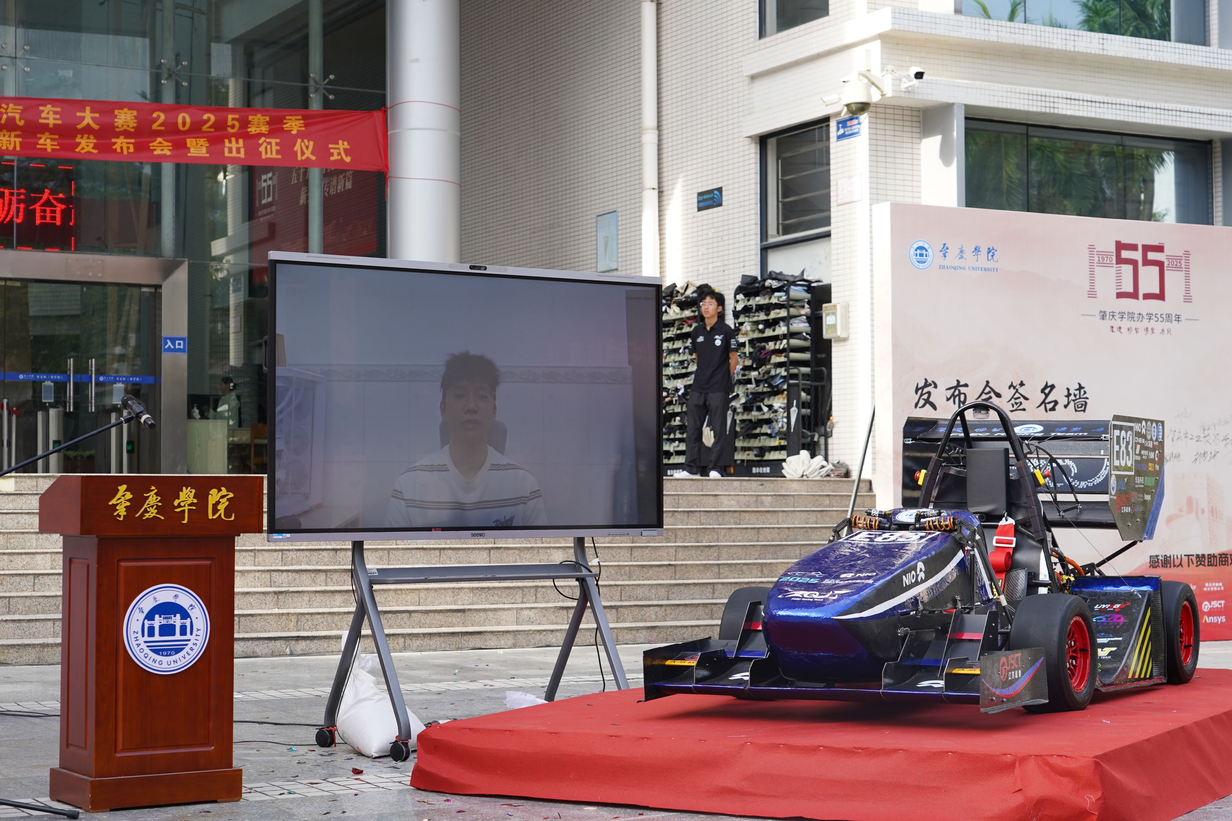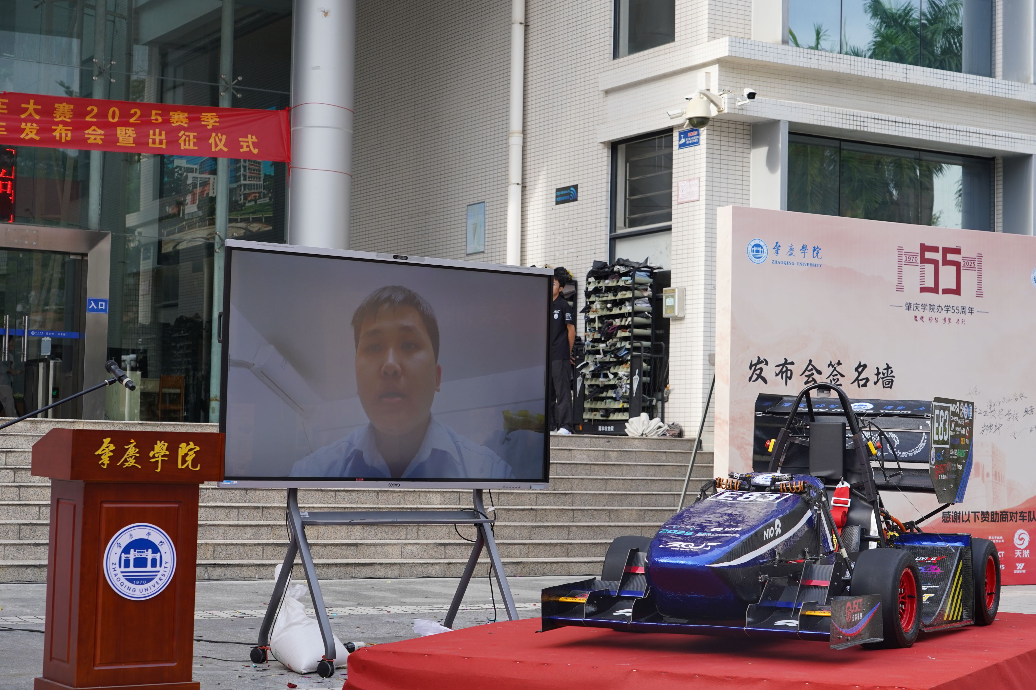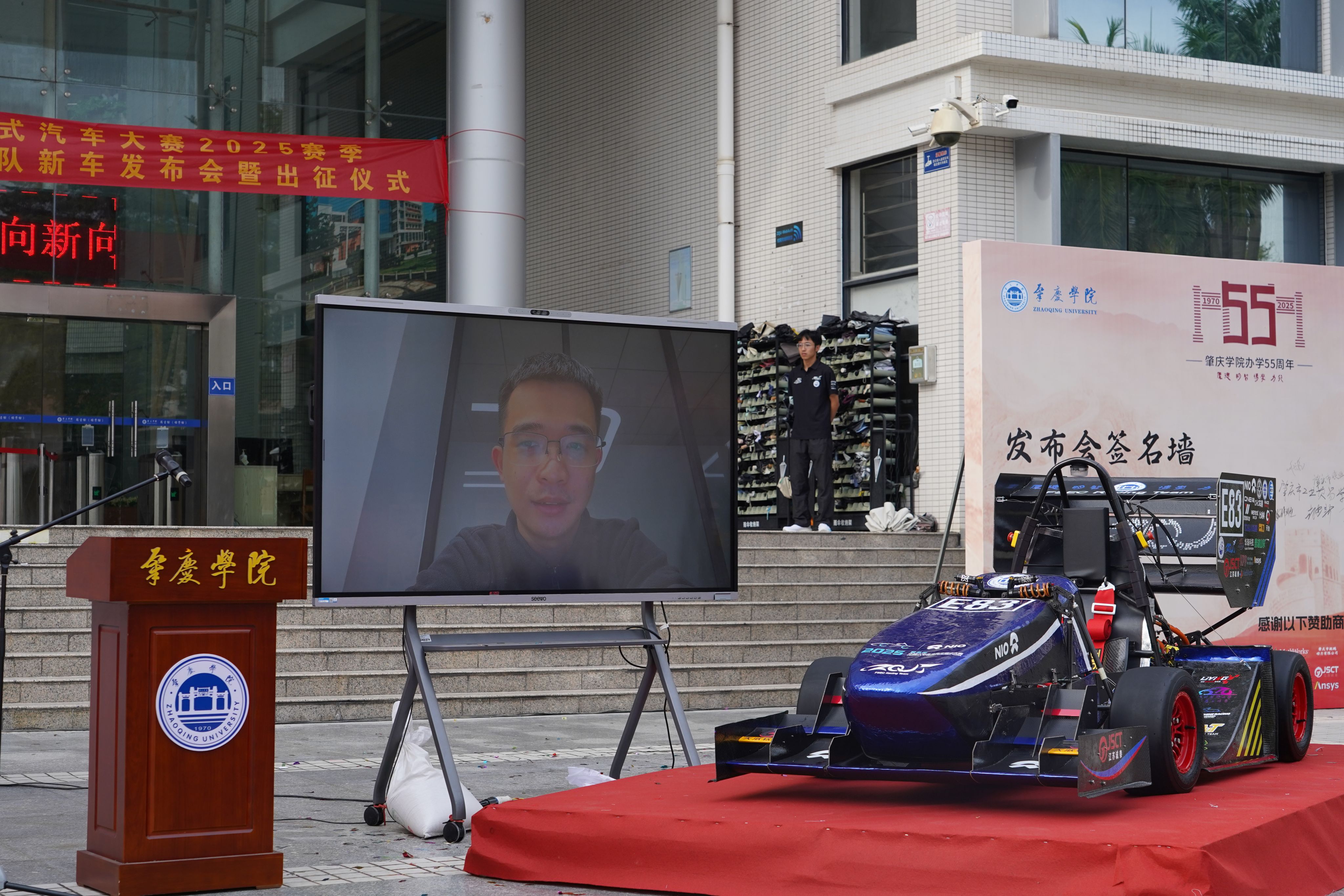 历任车队队长们用青春与汗水,为车队打下了坚实基础,他们的经历是车队最鲜活的教材。肇庆学院大学生电动方程式赛车车队第一任队长是2015级车辆工程专业1班卢志东,现就职于广州小鹏汽车科技有限公司,是一名嵌入式系统开发高级工程师。第二任车队队长是2016级车辆工程专业1班叶裕兴,现就职于比亚迪汽车工程研究院,是一名工程师。第三任车队队长是2018级车辆工程专业班罗金杰,现就职于富奥汽车零部件有限公司,是一名应用层算法开发与标定工程师。三位队长听到新一届方程式赛车队已经整装待发,出发征战合肥赛场时,内心饱含激动与感慨,由于工作原因不能到场,通过视频方式向大家分享了各自大学期间在车队增长的才干,鼓励师弟师妹们多钻研多实践。三位队长对本次新车发布会暨出征仪式的顺利召开表示热烈祝贺,向辛勤付出的师生团队致以敬意,同时衷心祝愿学校事业蒸蒸日上、凌砚电车队在新赛季勇创佳绩、载誉而归。