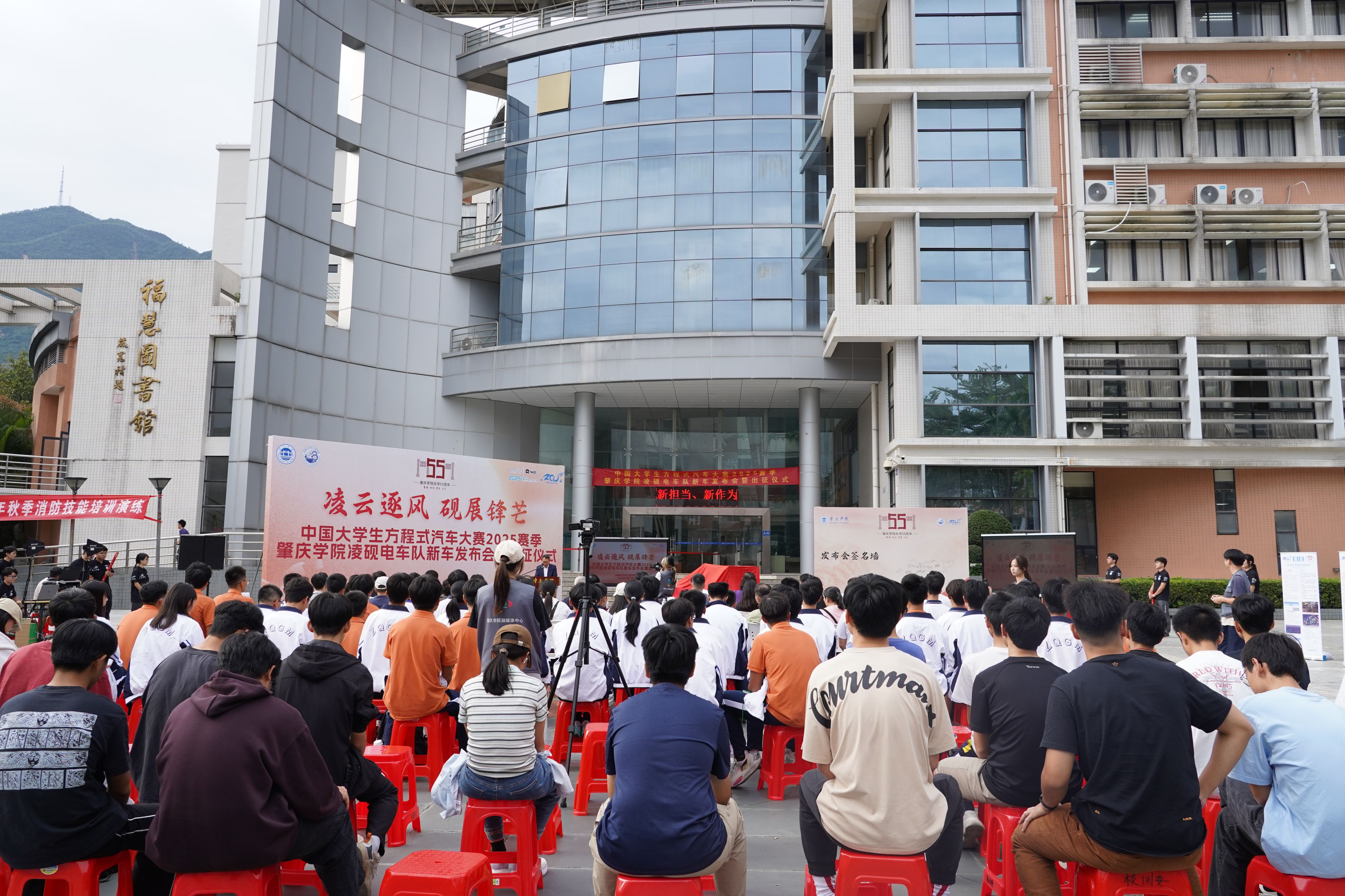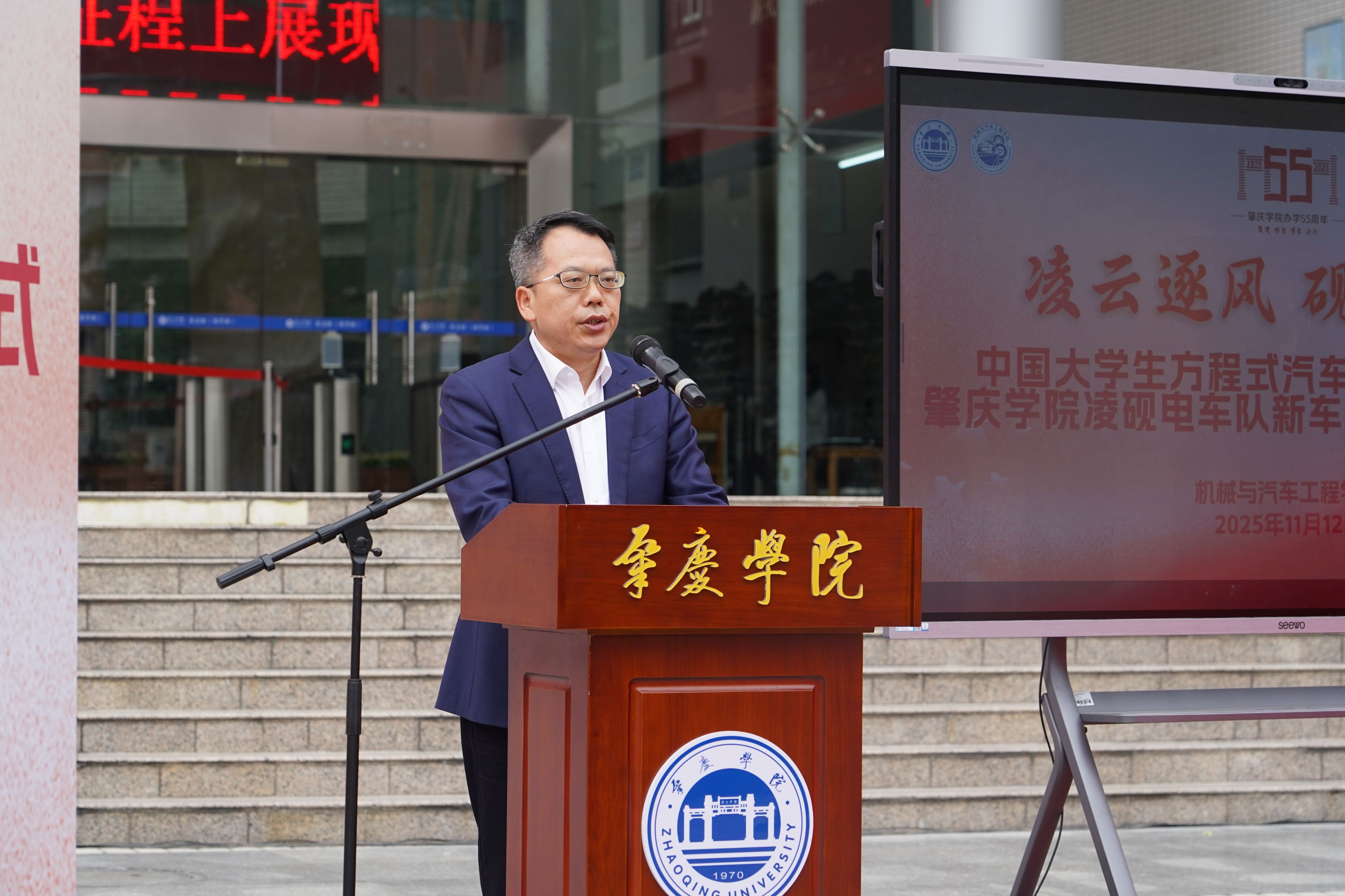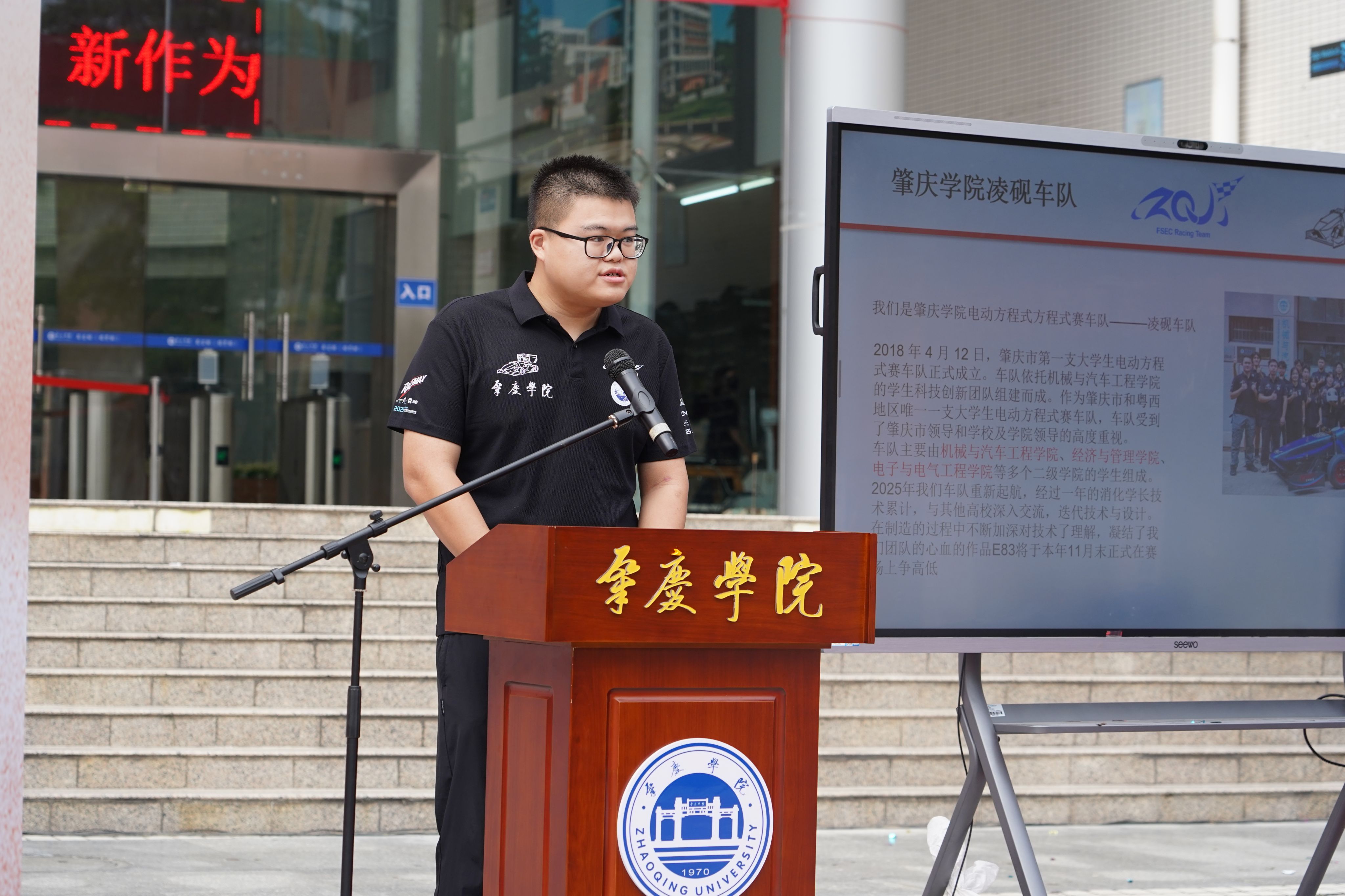 11月12日下午,机械与汽车工程学院承办的学校办学55周年高质量发展大会活动之一的中国大学生方程式汽车大赛2025赛季肇庆学院凌砚电车队新车发布会暨出征仪式在肇庆学院图书馆门前广场举行。本次新车发布会主题是:“凌云逐风,砚展锋芒”,承载着肇庆学院凌砚电车队的奋斗与期盼,也凝聚着学校、企业和全体队员的心血与汗水。肇庆学院凌砚电车队队员们经过无数个日夜的努力,倾注心血的新赛车代号为“凌砚-25”、车号“E83”的方程式赛车,终于整装待发,准备征战赛场!这得益于学校领导和学院老师的大力支持,这也是一段坚守与追梦的故事。
