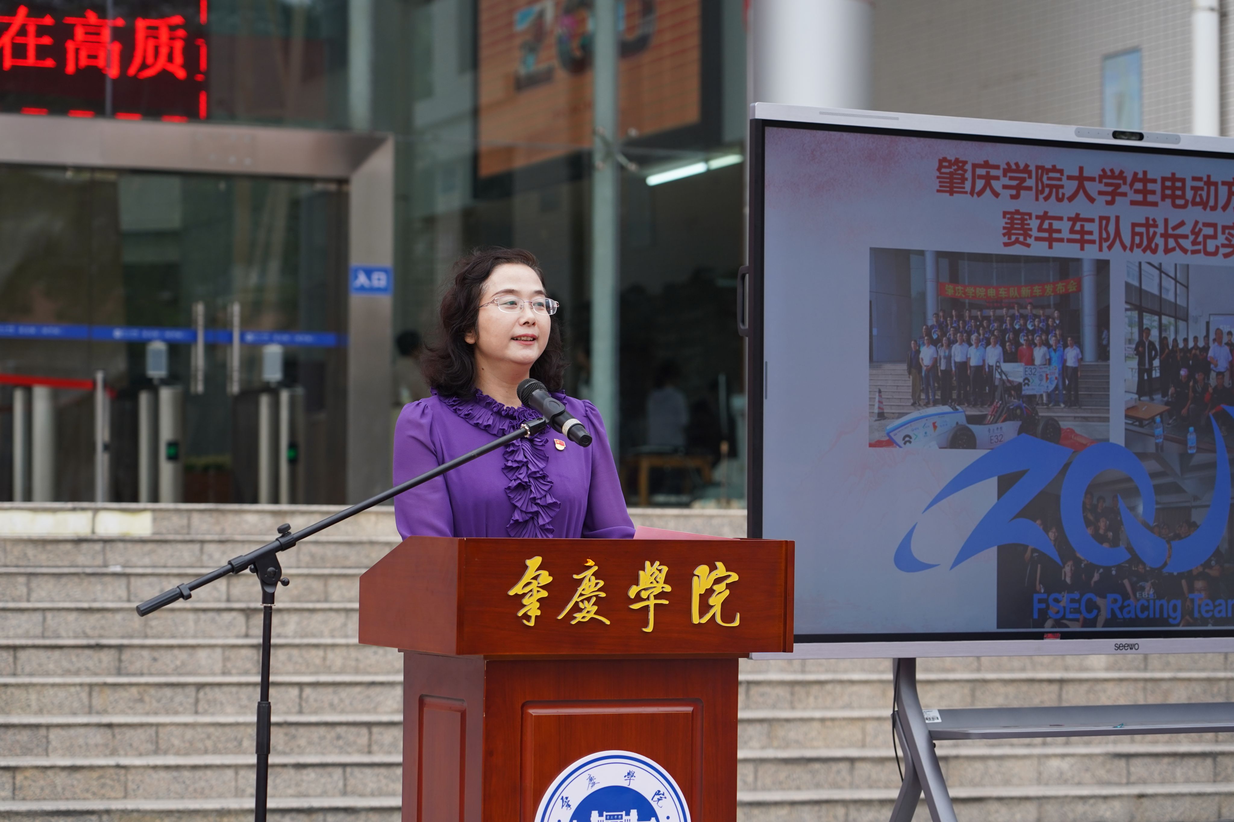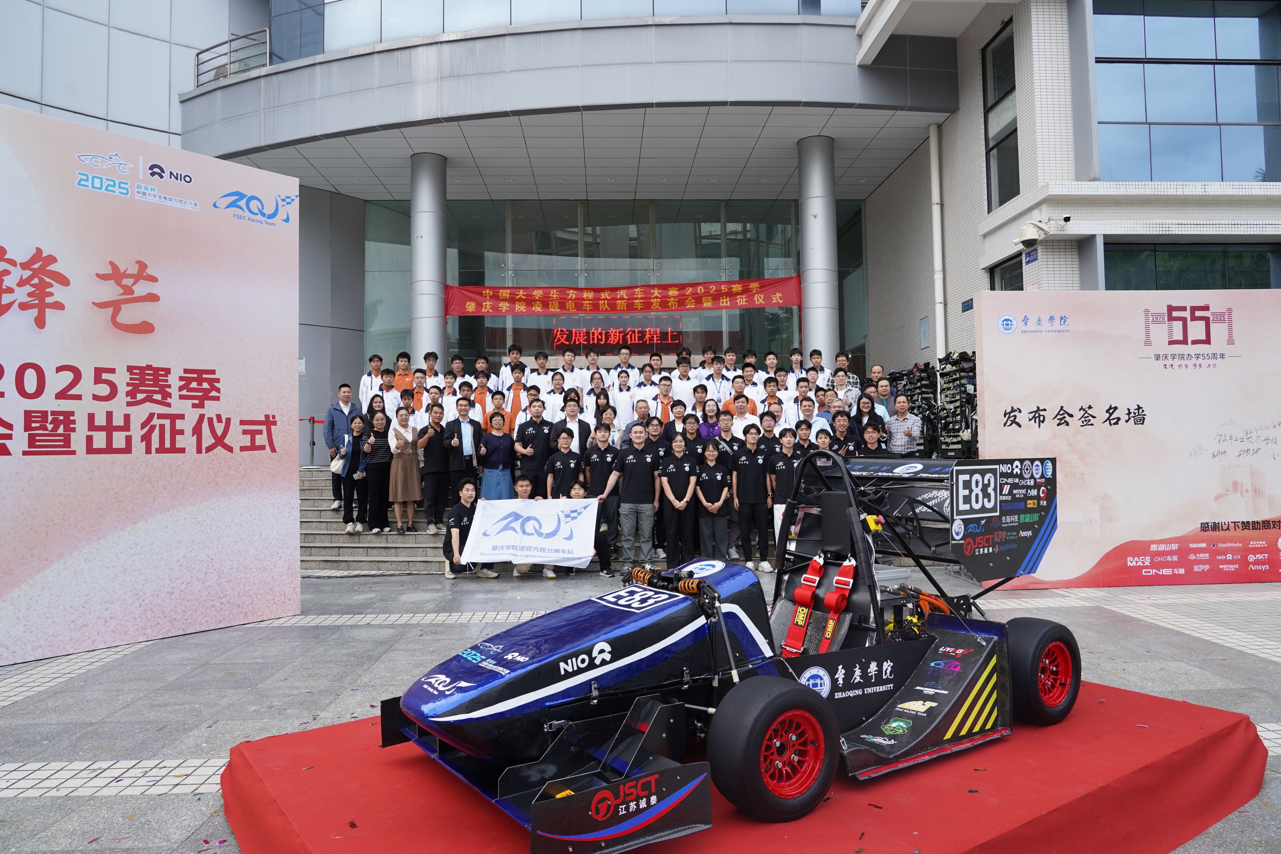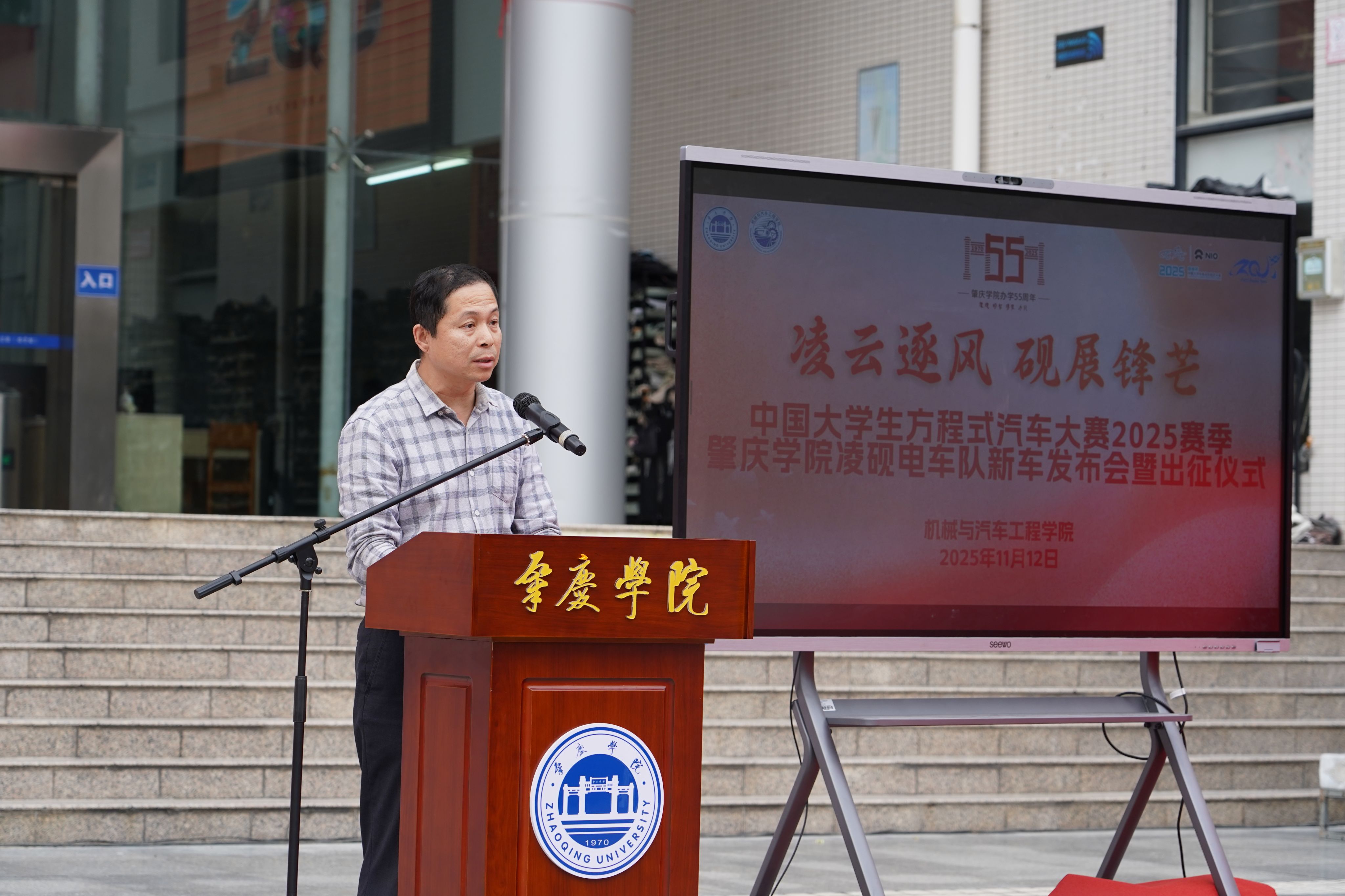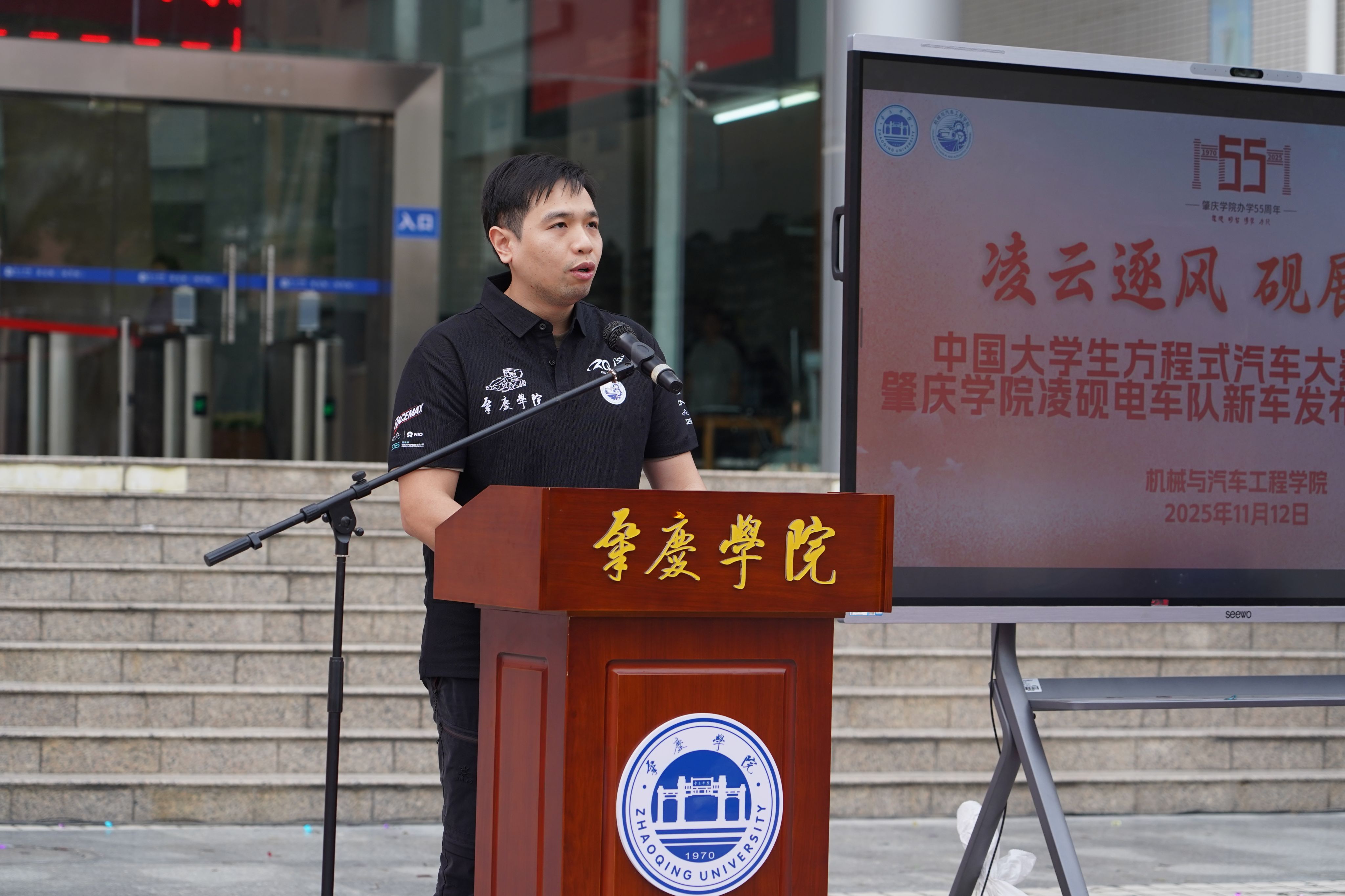 11月12日下午,机械与汽车工程学院承办的学校办学55周年高质量发展大会活动之一的中国大学生方程式汽车大赛2025赛季肇庆学院凌砚电车队新车发布会暨出征仪式在肇庆学院图书馆门前广场举行。本次新车发布会主题是:“凌云逐风,砚展锋芒”,承载着肇庆学院凌砚电车队的奋斗与期盼,也凝聚着学校、企业和全体队员的心血与汗水。肇庆学院凌砚电车队队员们经过无数个日夜的努力,倾注心血的新赛车代号为“凌砚-25”、车号“E83”的方程式赛车,终于整装待发,准备征战赛场!这得益于学校领导和学院老师的大力支持,这也是一段坚守与追梦的故事。