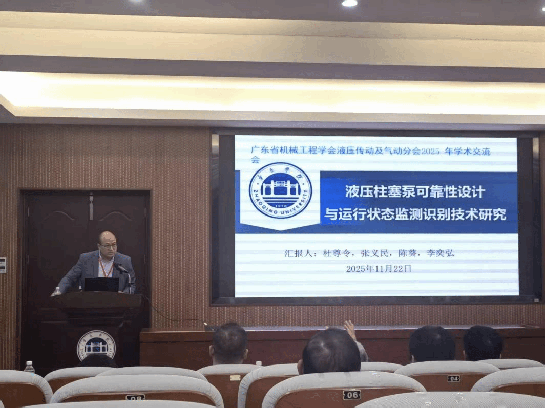 开幕式上,广州嘉泰液压机电有限公司总经理方伟松、分会理事长丁问司分别致辞,童伟秘书长介绍了会议筹备情况。学术报告环节由丁问司理事长主持,共安排了7场高质量学术报告。肇庆学院机械与汽车工程学院杜尊令老师作了"液压柱塞泵可靠性设计与运行状态监测识别技术研究"的主题报告,分享了我校在液压系统可靠性领域的最新研究成果。其他报告同样精彩纷呈,包括华南理工大学刘亚俊教授的"基于深度学习的液压桩锤代理模型研究"、广东工业大学邹大鹏教授的"冷冻电镜送样系统真空度的测控技术研究"等,内容涵盖AI驱动、数字化转型、机理与数据融合等行业前沿话题。