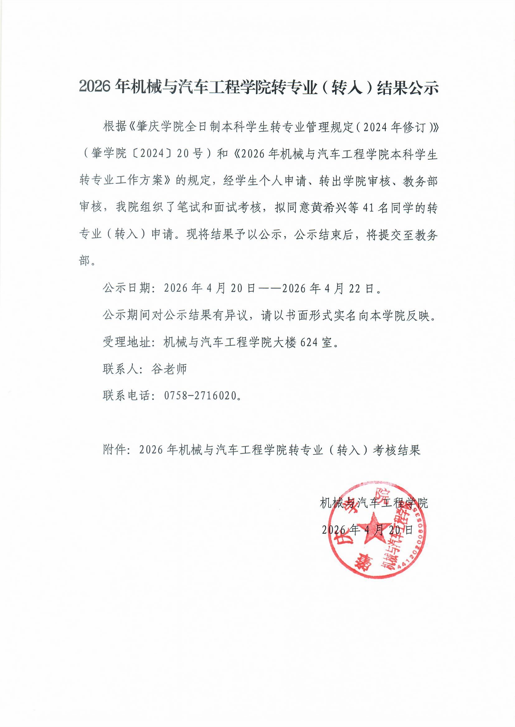 2026年机械与汽车工程学院转专业(转入)结果公示